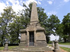 Denkmal auf dem Schlachtberg bei Königgrätz mit der Inschrift: Den heldenmütigen Kriegern Österreichs und Sachsens, 3.Juli 1866. Insgesamt fielen 44.000 Mann.